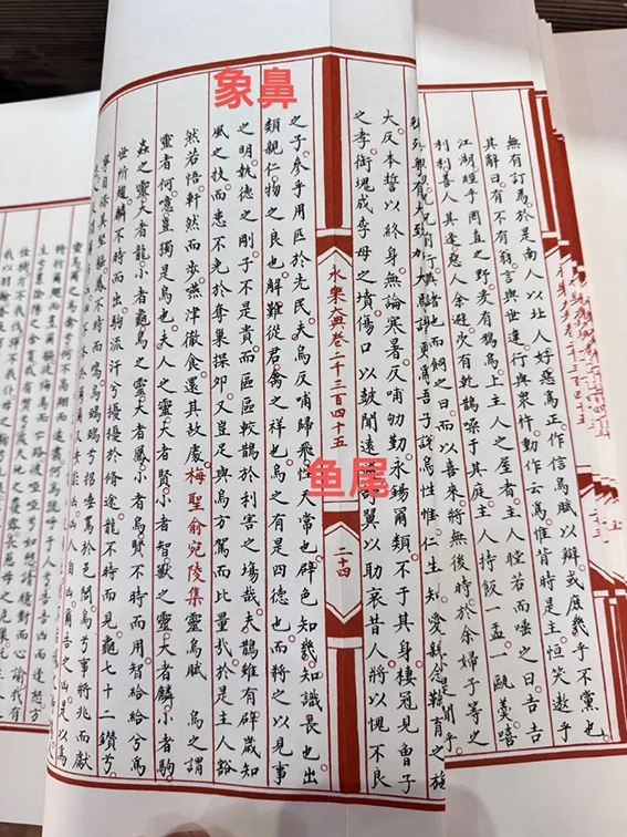鱼尾的上下方,常延伸出一条细长的黑线,因其形似象鼻,故得名象鼻。象鼻的存在,构成了古代版本学中一个重要的概念——“口”。带有黑线的称为黑口,根据线条粗细又分“大黑口”与“小黑口”;无线者则称白口。版本风格流变,于此可见一斑:宋元刻本及明初刻本多为大黑口,气象雄浑;至明中期以后,刻书风格趋于秀雅,白口或细黑口成为主流,如汲古阁刻本便以秀雅的白口著称。而清代内府武英殿的刻本,更在实用之外追求华美,常使用朱红色刷印版心,称为“朱墨套印本”,朱色象鼻与墨色文字相映成趣,堪称书籍艺术品。