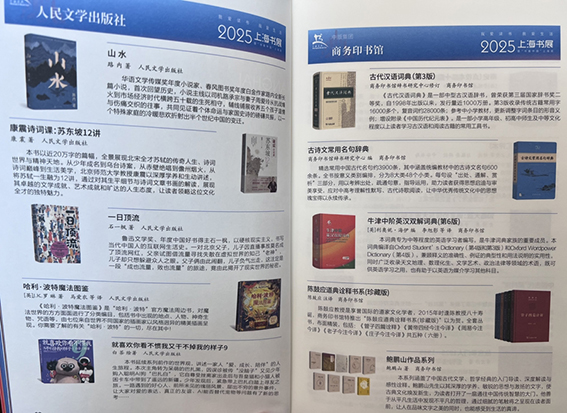 此次亮相上海书展重大项目有《复兴文库》(第一至三编)、《中国大百科全书》(第三版)等;重点主题出版物有纪念抗日战争胜利八十周年主题图书,如连环画出版社《胜利与和平——纪念中国人民抗日战争暨世界反法西斯战争胜利80周年连环画典藏》、生活·读书·新知三联书店《七七事变前夜的中国(1931—1937)》、研究出版社《伟大建党精神研究丛书》等;重点新书有人民文学出版社《就喜欢你看不惯我又干不掉我的样子9》、商务印书馆《古代汉语词典》(第3版)、中华书局