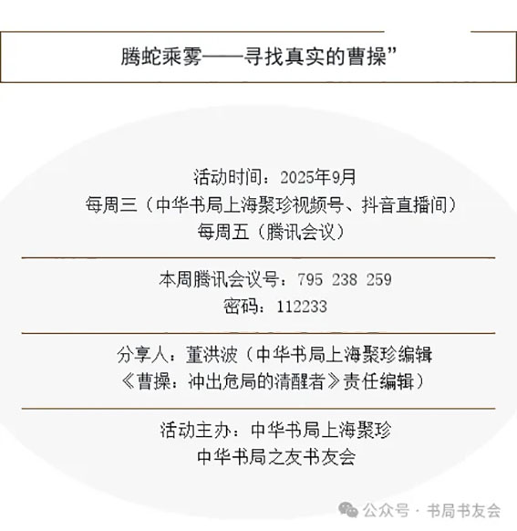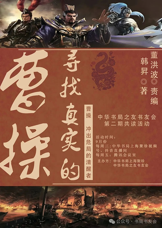 2023年,中华书局上海聚珍携手中华书局之友书友会,共同举办了“中华聚珍线上共读”系列活动,反响强烈。今年是曹操诞辰1870周年,去世1806周年,更是曹操墓发现17周年,值此之际,上海聚珍再次与中华书局之友书友会合作,深入挖掘历史文化内涵,激发大众对经典文化的阅读兴趣,特举办 “腾蛇乘雾——寻找真实的曹操” ——《曹操:冲出危局的清醒者》共读线上活动,带领参与者穿越时空,全方位解读曹操这一历史人物。