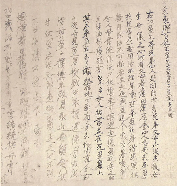 这件文书涉及一个兄弟四人分家后的家庭关系问题。大体是说,慈惠乡王盈子、王盈君、王盈进、王通儿四人是同胞兄弟,父母去世后分家,“所有父母居产田庄屋舍,四人各支分,弟盈进共兄盈君一处共活”。不久盈进身患重病,不到一年病亡。可是盈进却在当年轮到要承担重役。由于无人承担,就被当作流户看待。流户的“役价”无法填还,乃由同居之户承担,而盈进生病时本来就欠了很多债务,也落在盈君头上。盈君不堪重负,提出要把盈进在城外的7亩土地和城内外的房舍用以“填还债负及役价”。下文内容不太清楚,大体是长兄盈子对于此事有不同看法,不让用盈进的房屋田地来抵债。假若如此,那么所有债负及役价就得由同居之户王盈君负担,为此盈君提出诉讼。