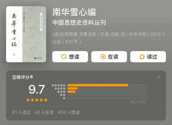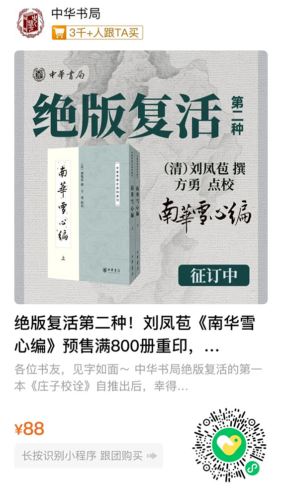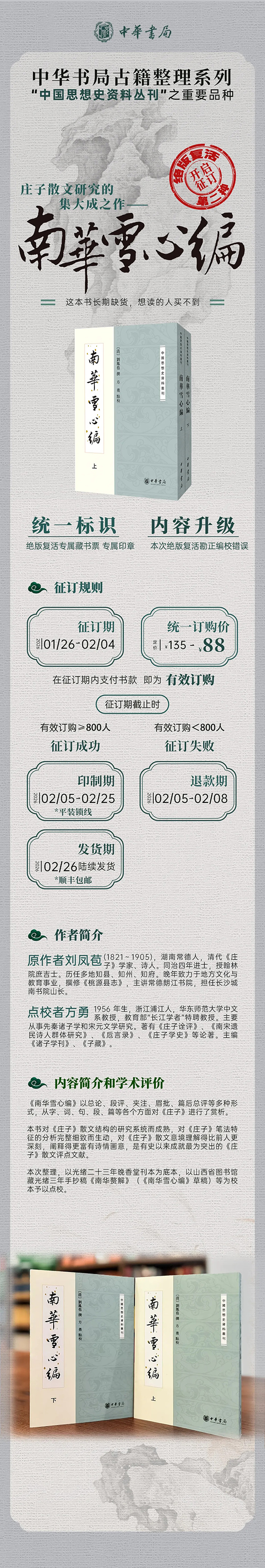 各位书友,见字如面~中华书局绝版复活的第一本《庄子校诠》自推出后,幸得各位的厚爱与支持,这份对庄学经典的珍视与认可,让尘封的古籍重焕生机,也让我们更坚定地奔赴与各位的经典之约。而今,我们带着满满的诚意,迎来了绝版复活系列的第二本重磅之作——清代刘凤苞所著的《南华雪心编》,这部堪称古代《庄子》文学阐释总结性的经典佳作,终于要与各位书友相见了。 关于《南华雪心编》