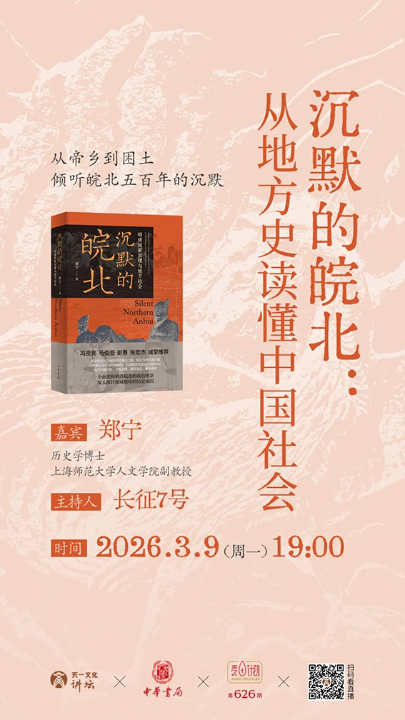 地处淮河之滨的皖北是大明王朝的龙兴之地,在明朝初年,这里曾是恢弘鼎盛的中都,为四方所瞩目。但在此后的五百多年时间里,短暂的辉煌逐渐散去,皖北更多呈现出民生疲敝的萧瑟景象,以至于成为贫困与落后的代名词。皖北因何走上沉沦之路,又为何长久无法走出?3月9日(周一)晚7点,《沉默的皖北》作者——上海师范大学郑宁副教授做客天一文化讲坛直播间,与读者一道从皖北的沉浮透视古代中国的国家治理与地方社会。本次对谈,郑宁老师将结合十余年深耕的研究与乡土情怀,解读皖北“沉默”的历史惯性与当代回响。