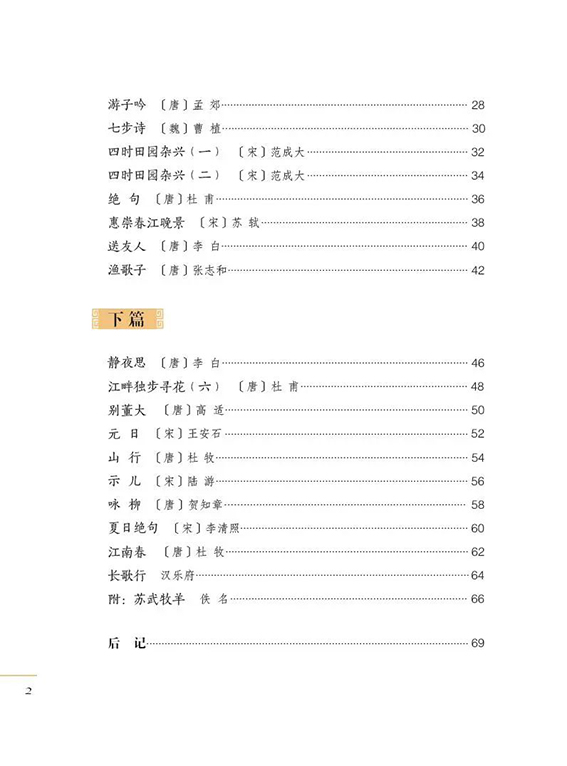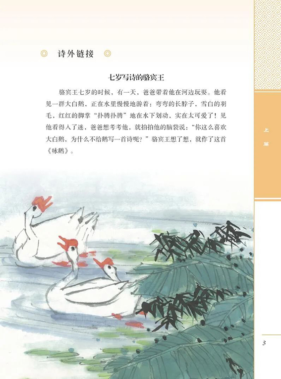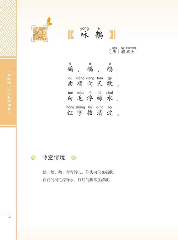 我们每个人,小时候都有学习古诗的经历。让孩子们学习古诗,趣味是最重要的了。怎么能让孩子们在初次接触古诗时,就能被吸引,觉得学习古诗是个有趣、快乐的事情呢?首先,得让古诗听起来好听。鲁迅在《从百草园到三味书屋》中,写到他的先生读诗文时“总是微笑起来,而且将头仰起,摇着,向后面拗过去,拗过去”。摇头晃脑的动作,加上抑扬变化的腔调,这种读书法就是传统的吟诵法。它介于歌唱和朗诵之间,按照字音的平仄以及方言声韵的发音特点,形成简单的旋律和腔调,还配合上身体晃动的动作。近些年来,在一批有志之士的积极努力下,抢救和修复了一批传统的吟诵调,为人们吟咏诵读古诗文提供了多种可能。在推广吟诵的过程中,我对家传的及老先生的传统吟诵调进行了修复。这次根据少儿的接受能力,借鉴说唱、古曲、地方戏曲等民族音乐素材,为精选的古诗创配了新的吟唱调,使这些古诗变成可以吟唱的“歌诗”。这些修复、编创的调子尊重传统吟诵“依字行腔”“缘情而发”的要求,又结合普通话的声韵特点,加强了吟诵的音乐性,使其更适合少儿学习。
