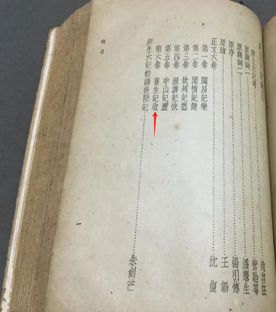 ↑“足本”《美化文学名著丛刊》之《浮生六记》内页,可见卷六为“养生记逍”