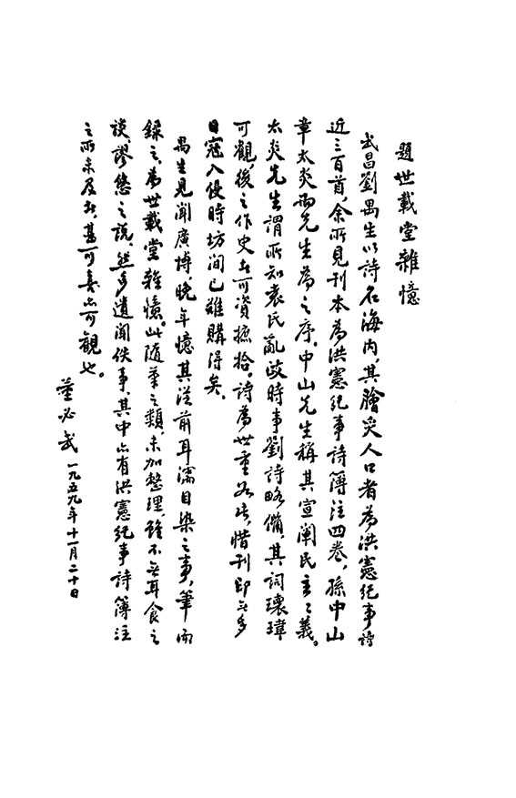 第四,保留作者的所有说明。《世载堂杂忆》在《新闻报》连载期间,刘成禺不断收到读者、朋友的来函,或提出新要求,或为其补充史实缺漏,作者也曾从朋友聚会中获取资料线索,甚至直接将别人的文稿整理润色后发表。对此,作者常在篇首加以说明。此次整理时将这些说明文字全部保留,以展现该书创作过程中的背景环节以及该书所凝聚的集体智慧。