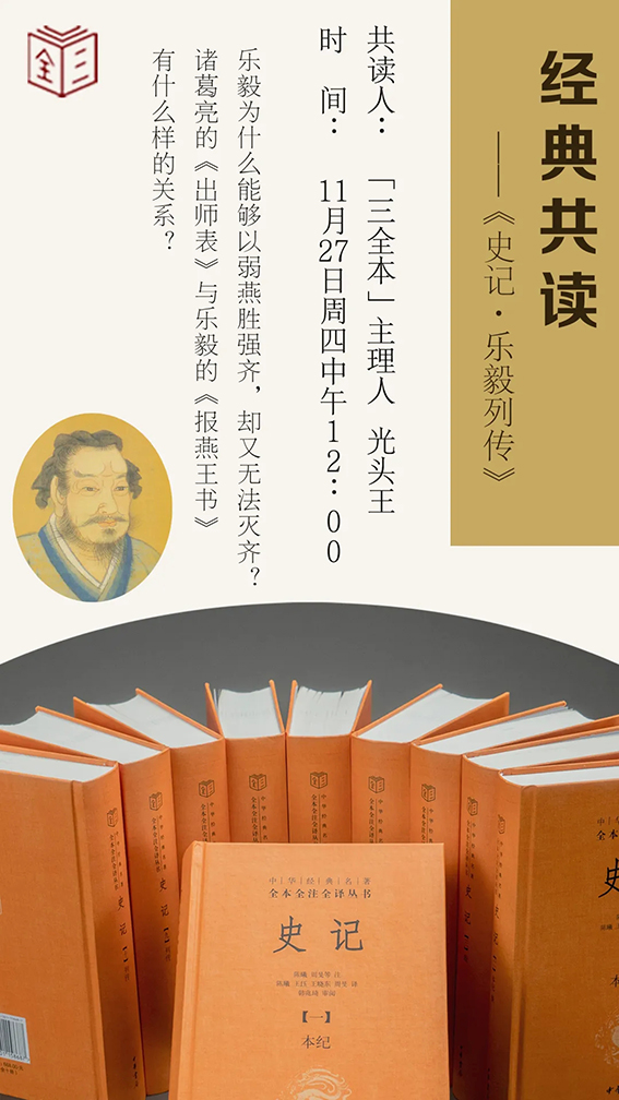 乐毅是我国古代伟大的军事家,也是后世膜拜的榜样。他不仅谱写了以弱胜强的光辉战例,也留下了传诵千古的名篇《报燕王书》。乐毅为什么能够以弱燕胜强齐,却又无法灭齐?类似燕惠王罢弃乐毅的做法,在《史记》里还有哪些,又有怎样的后果?诸葛亮的《出师表》与乐毅的《报燕王书》有什么样的关系?乐毅“古之君子,交绝不出恶声;忠臣去国,不洁其名”给当代人有怎样的启示?共读《史记·乐毅列传》,用的是书局的“三全本”《史记》,已经有书的,建议带上第八册(《乐毅列传》)来听。手里没有书,也没关系,我们在现场会贴心展示~
