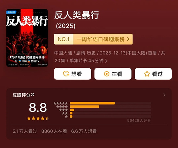 近期豆瓣评分8.8分的电视剧《反人类暴行》热映,引发广泛关注,抖音话题热度达到21亿。这部作品以冷静克制的镜头语言,将侵华日军731部队的黑暗历史重新推至公众视野:在伪满洲国腹地,一个名为“731”的秘密部队,以“防疫给水”为名,系统性地实施活体解剖、细菌感染、冻伤实验等反人类罪行。剧中没有过度渲染血腥,却通过一个个微小却震颤人心的细节,让观众真切感受到,在所谓“科学”与“帝国使命”的外衣下发生的人类历史上史无前例的医学暴行。