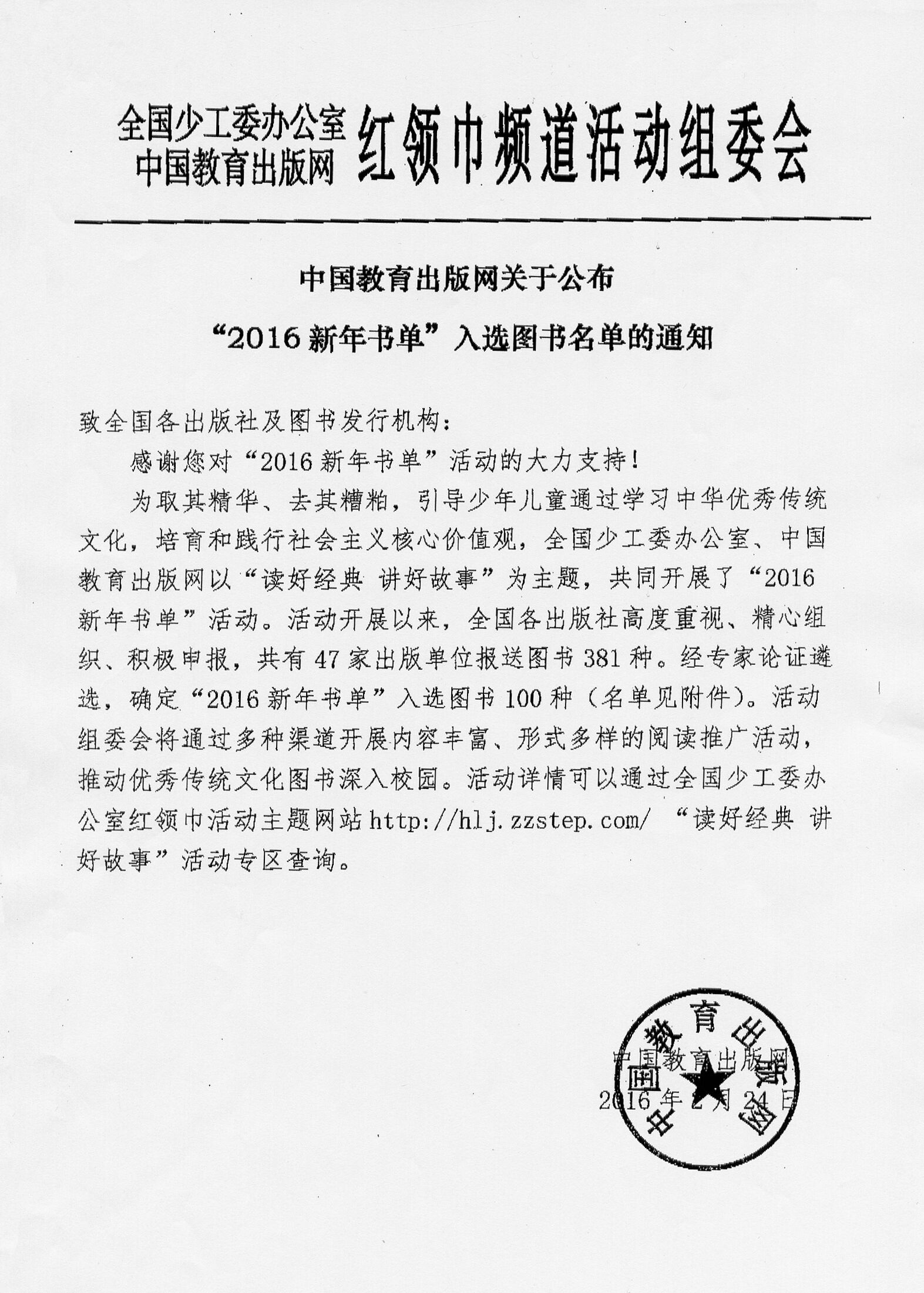 2015年11月,全国少工委办公室、中国教育出版网“2016新年书单”图书征集评选活动正式启动。本次活动联合了全国47家出版社共同参与,经25位专家伦论证遴选,确定“2016新年书单”入选图书100种,为全国的少年儿童送上一份新年大礼。本次活动中,中华书局入选33种图书。