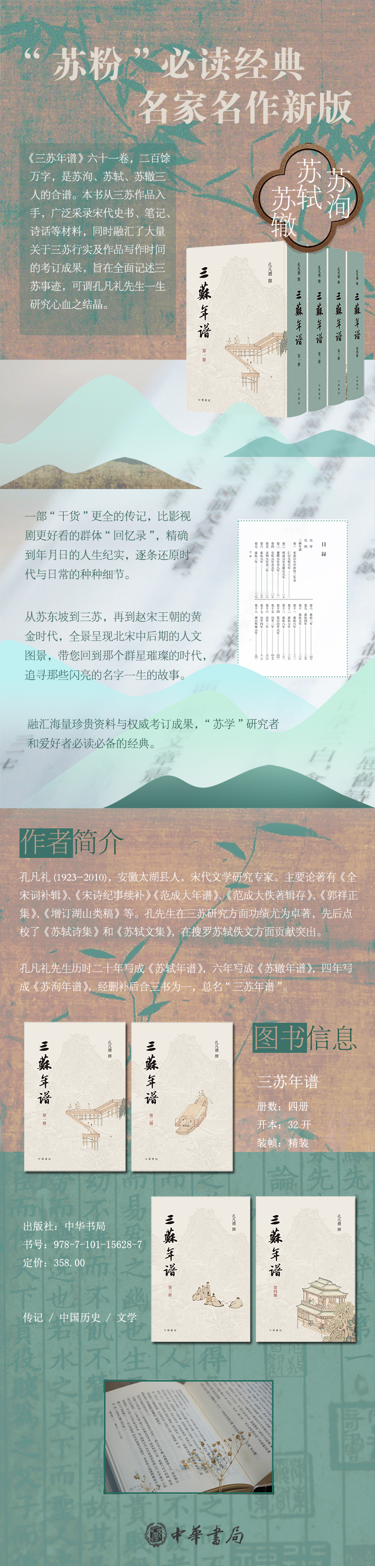 一九九八年,孔凡礼先生积二十余年之力完成的《苏轼年谱》由中华书局出版,获得学界广泛赞誉。几年后,《苏辙年谱》与《苏洵年谱》也先后面世。之后,在前三谱的基础上,孔先生又对苏洵、苏轼和苏辙的生平、交游、著述等再次进行了全面考察,整合三谱,补其阙略,去其复叙,终成新作《三苏年谱》。