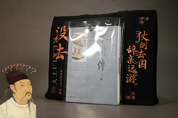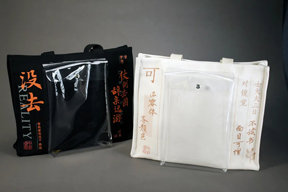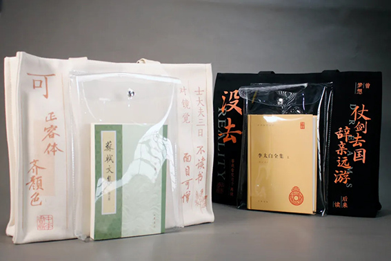 乍一看包身上的文字,是不是觉得不太通顺,缺了点什么?没关系!只要将最近正在读的好书放入pvc袋中,图书本身便填补了文字之间的停顿空白。比如: