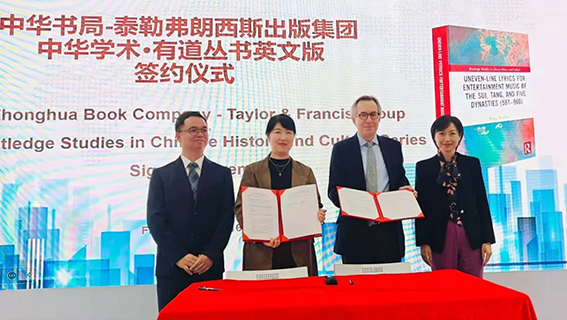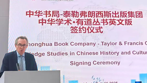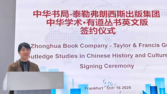学术精品是中华书局在本届书展上推介的重点。中华书局与多家世界知名学术出版机构保持长期合作,这些机构与中华书局的出版理念高度契合,始终关注中国学术界的名家名作、当代领军学者的代表作以及青年学者的创新研究成果。中华书局致力于将这些最具代表性、最经典、最前沿的学术成果推向世界舞台。本届书展展出的梁方仲著《明代一条鞭法》、陈引驰著《文脉的演进》、周鸿承著《味染欧罗巴:中国饮食文化在西方(1500—1700)》、宋德金著《比邻而居:辽金西夏民族生活史》等就是其中的优秀代表。 当地时间10月16日14点,在法兰克福书展中国联合展台,中华书局与泰勒弗朗西斯出版集团举办“中华学术有道”丛书英文版(Routledge Studies in Chinese History and Culture Series)签约仪式。出席活动的嘉宾有中宣部办公厅调研员吴中国,英国泰勒弗朗西斯出版集团全球图书业务总裁贝谨立先生,英国泰勒弗朗西斯出版集团全球编辑部图书出版人、国际合作与出版主管孙炼女士,中华书局有限公司副总经理林佳红女士。活动由中华书局版权经理张之光主持。 英国泰勒弗朗西斯出版集团全球图书业务总裁贝谨立先生说,在这个相互联结的世界里,理解多元文化传统及其演变的重要性怎么强调都不为过。这套丛书为全球关于中华文明的深入对话提供了助力,让国际社会得以从更多视角了解中国丰富的知识与文化遗产。我们与中华书局的合作,充分体现了国际学术合作的变革力量。通过这一联合出版项目,我们成功搭建起跨大陆学术社群的桥梁,打造了超越语言与文化界限的深度知识交流平台。