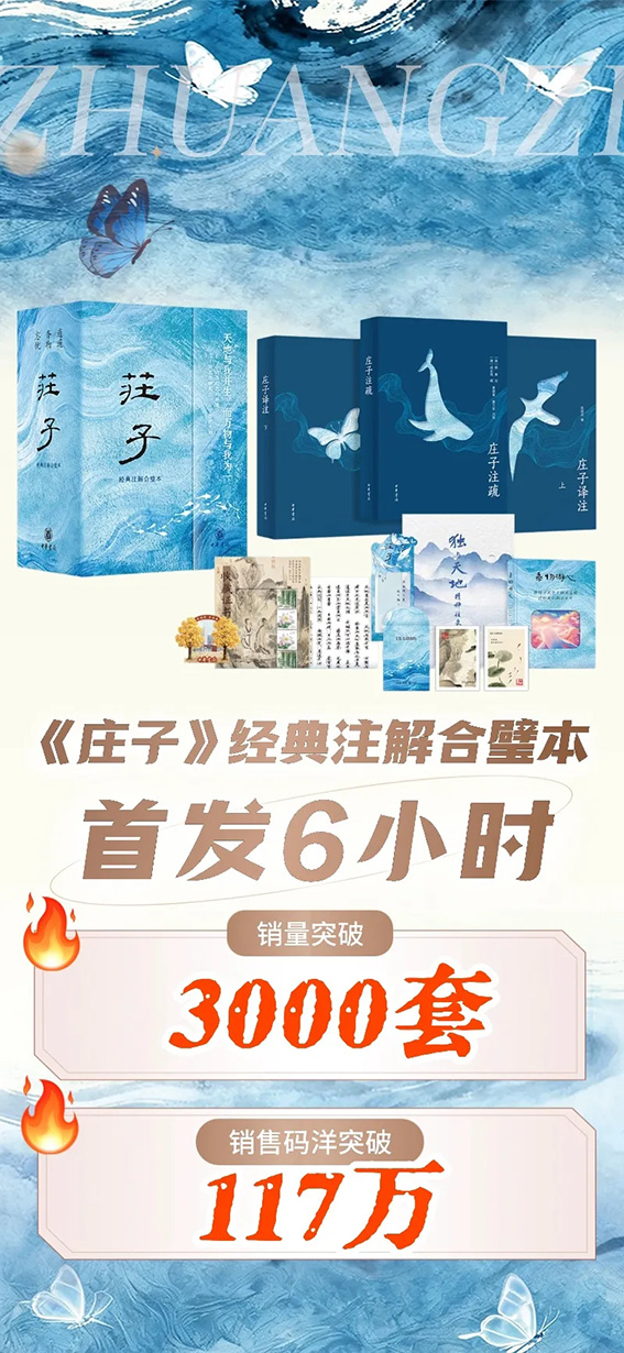 今天,经过我们反复酝酿、精心打磨的《庄子(经典注解合璧本)》上市了!这是中华书局继《道德经(马王堆汉墓发掘五十周年纪念本)》、《孙子兵法(讲解译注典藏本)》之后出版的又一部核心典籍的特装书。前几天,我们发布新书预告之后,各位读者翘首以盼,在今天的首发中给予了热烈的追捧。我们在此向广大读者致以诚挚的感谢。这本书到底是何来头,有何玄妙,请让我们向您一一道来。