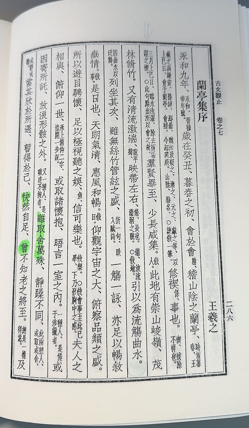 买了一本贵单位名家精译古文观止(2007年第2版),读兰亭集序,书上写道:虽取舍万殊,....曾不知老之将至。取舍还是趣舍啊,曾字原文中有么?请教一下。