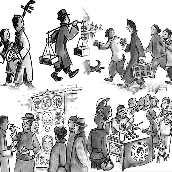 那么,如何让读者知其然更要知其所以然呢?为此,中华书局2019年专门推出注音注释插图本,对《江湖丛谈》全部行话、术语注音释义。比如书中提及最多的一个词“调侃儿”——如果读作条砍,完全是另一个词,即用言语戏弄嘲笑、开玩笑,而书中这个词的意思是说行话、用行话交流——两者大相径庭。所以调读掉,而不读条;侃后面必须要加儿化韵。这和“水牛”&“水牛儿”(蜗牛)、“白面”&“白面儿”(海洛因)同属一理。再比如“粘啃”,意思是人病了。粘读年,而不读詹;啃的读音则介于四声和轻声之间,而不读恳。类似的例子不胜枚举,几乎涵盖全书。因此,注音注释插图本作为工具书,完全可以帮助读者知其然更知其所以然,真正读懂吃透《江湖丛谈》,从而深入探究错综复杂的行业秘辛,切实领略光怪陆离的形色江湖。插图系著名漫画家李滨声配绘,通过近60幅图画清晰再现昔日江湖行当原貌,生动传神,与原著堪称珠联璧合。