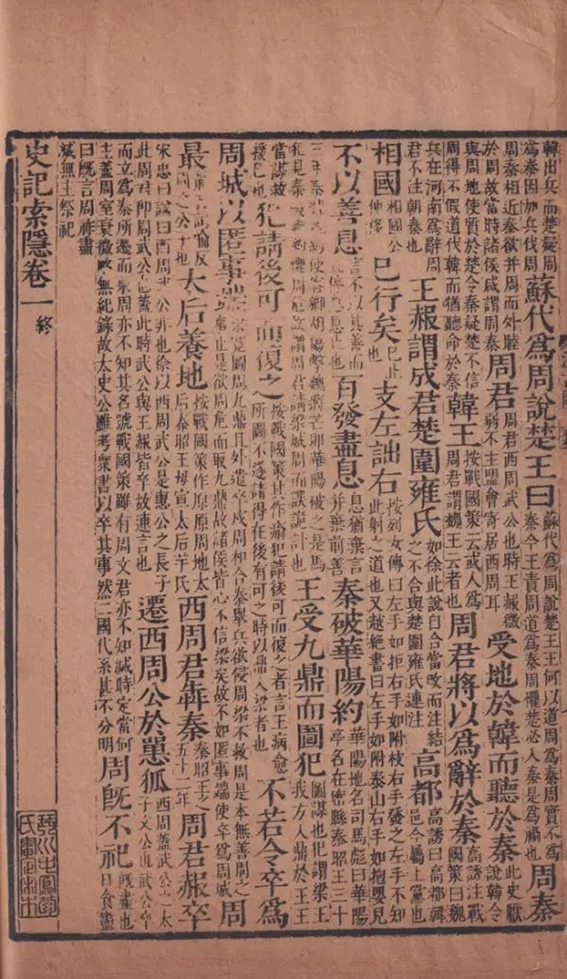 最著名的,就是“三家注”——南朝宋裴骃的《史记集解》,唐司马贞的《史记索隐》、张守节的《史记正义》。《索隐》《正义》本来都是各自单刻的,到北宋时,三家注才与《史记》合一,附在有关正文后面。