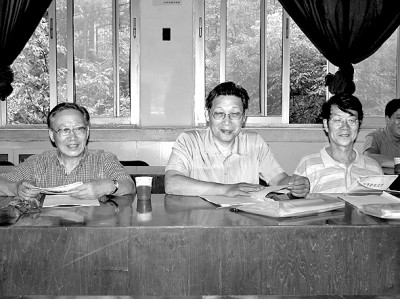 楼宇烈(中)和学者方立天(左)、牟钟鉴在一起。