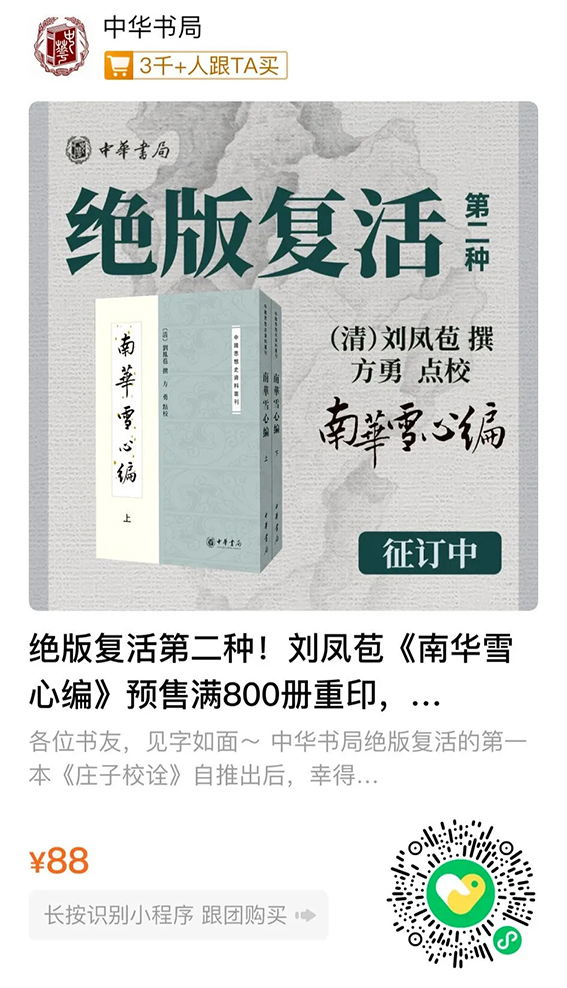 在《庄子校诠》的征订期间,我们收集到读者反馈的复活心愿有一百多种,其中有一种仍以庄子研究为主题的《南华雪心编》呼声最高。