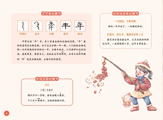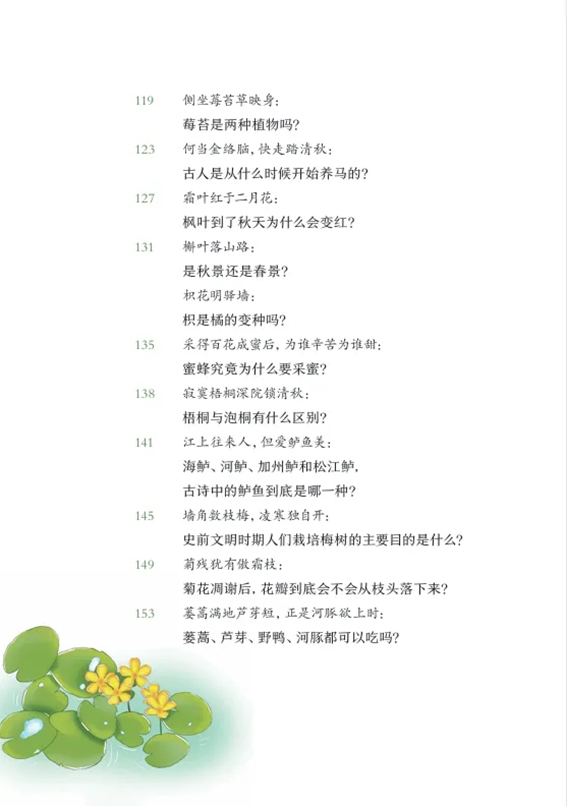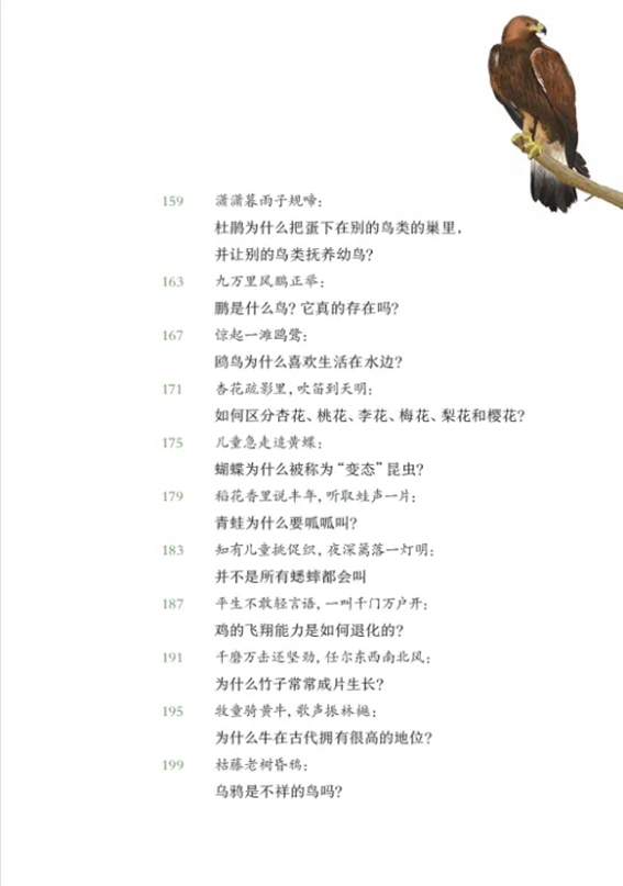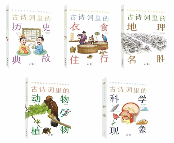 全套共五册,包括《古诗词里的历史典故》《古诗词里的衣食住行》《古诗词里的地理名胜》《古诗词里的动物植物》和《古诗词里的科学现象》。