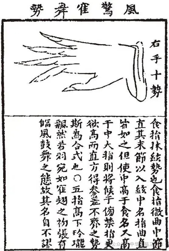 閟笺》所录古琴剖面图。下为《左右手二十势图说》中的“风惊鹤舞式”: