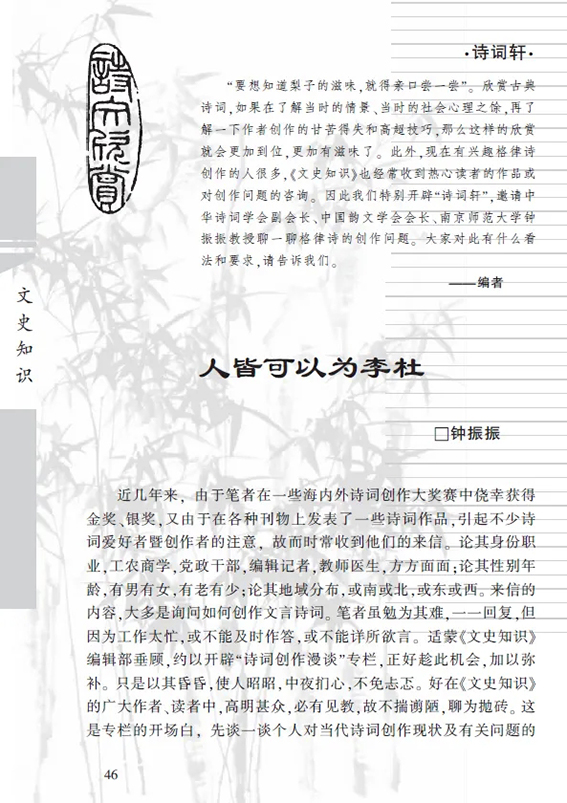 南京师范大学文学院资深教授、著名古典文学研究专家钟振振先生于2026年3月22日不幸逝世,享年76岁。推送钟先生2005年刊登在《文史知识》“诗文欣赏”诗词轩的一篇文章,以此纪念先生。